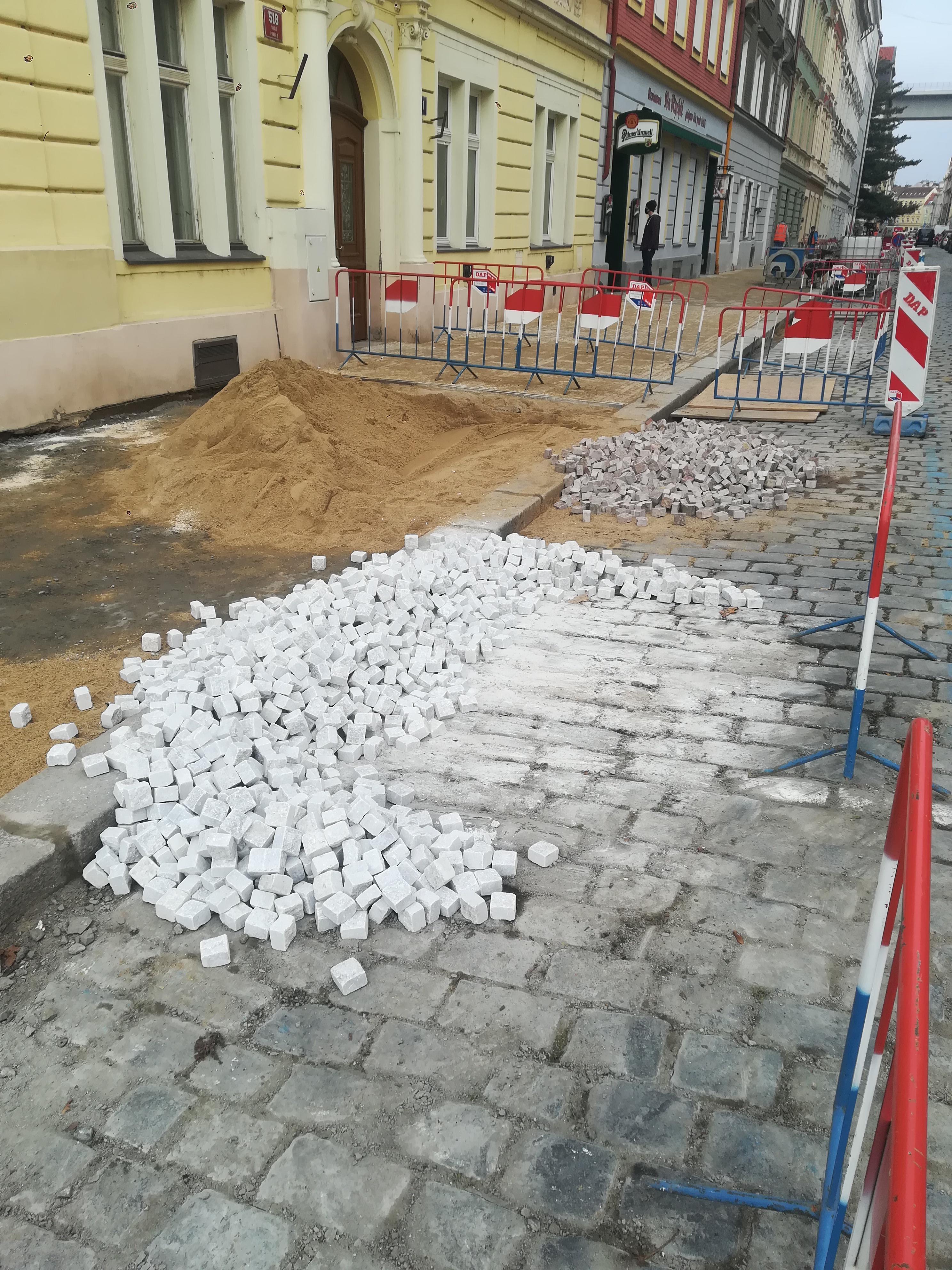 Typická "kočičí hlava" ve vozovkách byla dříve z nažloutlého křemence, což dávalo městu charakteristický zlatavý nádech, později nahrazený odolnější žulou.